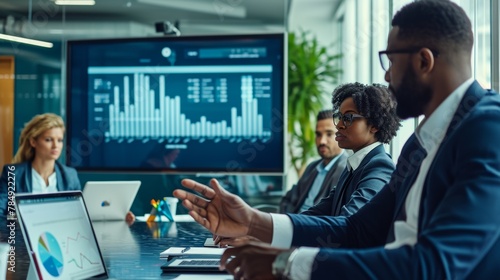 Indian Male Product Distribution Expert Holding Laptop Computer, Analyzing World Map On Big Digital Screen In Monitoring Office. Successful Man Looking For Efficient Routes For International Delivery