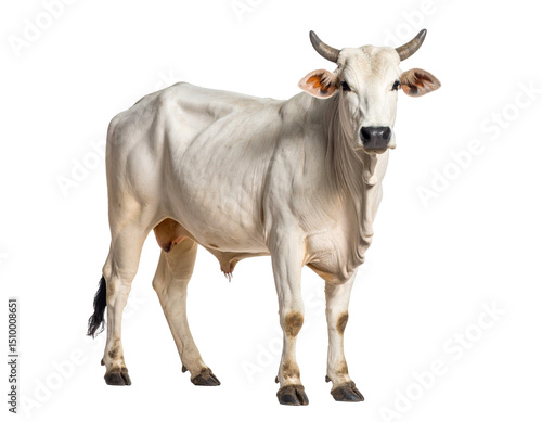 Indian street cow standing calmly, front-facing angle, white background, Transparent PNG