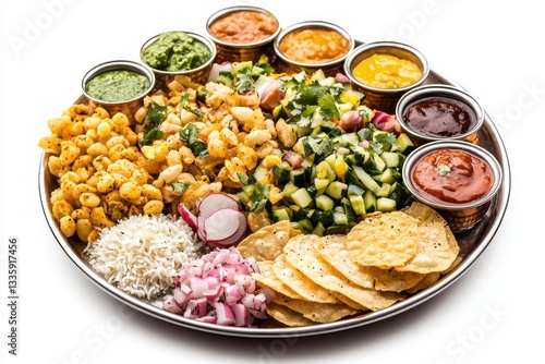 Indian Street Food Platter Savory Mix Chaat Delights: Crispy Poori Fresh Vegetables Tangy Chutney Presentation