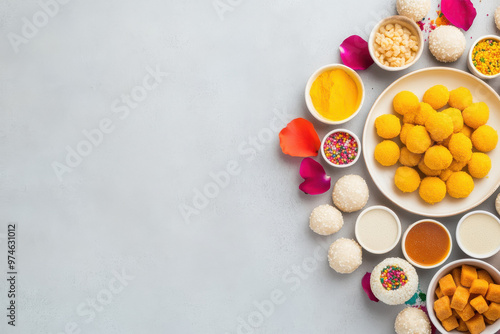 Indian sweet plate with laddus, rose petal patterns and a colorful mandala design around it on the floor.