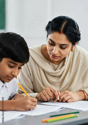 Indian teacher assisting young student with schoolwork, providing guidance and support in classroom setting