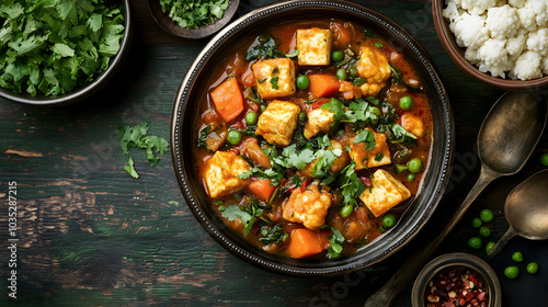 Indian vegetable curry containing carrots, cauliflower, peas, beans, baby corn, capsicum, and paneer -