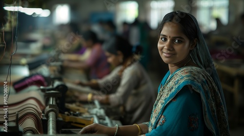 Indian Woman in Textile Factory Wearing Blue Sari Smiling at Camera