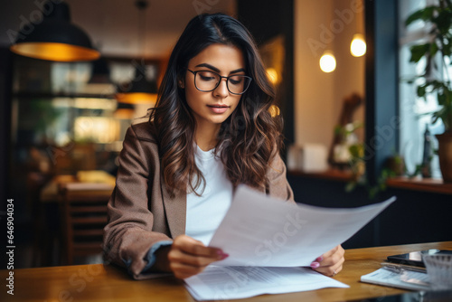 Indian woman sitting on desk and checking some financial paper