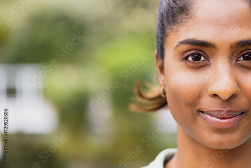 Indian woman smiling gently in garden wearing small hoop earrings and nose stud, copy space