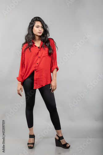 Indian young female model in casual wear against grey background - stock photo. Long black haired model wearing red shirt and black jeans.