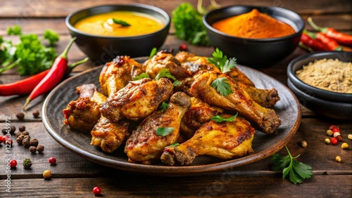 Indian-inspired honey mustard chicken wings and legs, plated on black with aromatic spices.