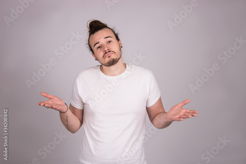 indifferent body language, whatever facial expression man isolated, studio shot on white background
