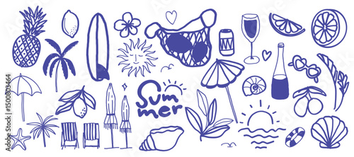 Indigo Italian hand drawn summer element vector set. Coconut Tree, pineapple, wine, sheel, lemon, foliage, sun, umbrella. Design for decorative, card, cover, poster, product deco.