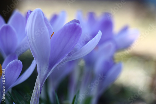 Indistinct flower forms of large blue crocuses create a tenderness picture.