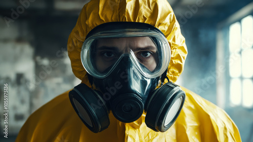 Individual in yellow protective suit and gas mask poses in an abandoned industrial setting with dramatic lighting during daytime