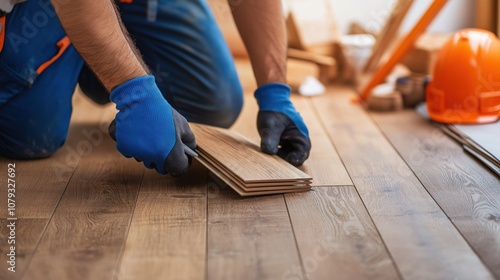 individual kneels on the ground, skillfully laying wooden planks for flooring in a well-lit room, surrounded by renovation tools and materials, showcasing dedication to the project