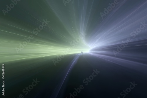 Individual standing alone in a surreal light landscape with vibrant colors creating a sense of depth and dimension