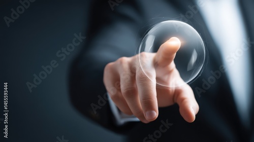 Individual touching a transparent button representing a futuristic investor interface concept for premium wealth management