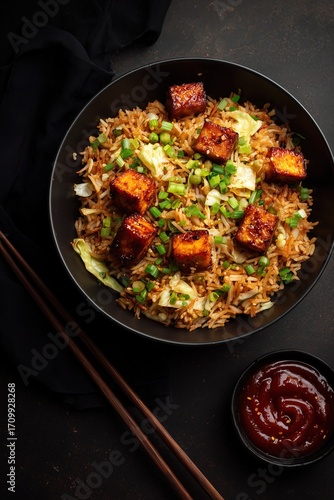 Indo-Chinese fried rice bowl with soy paneer and chili garlic sauce