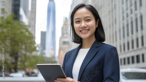 Indonesian business woman in suit smiling holding tablet at city with skyscrapers