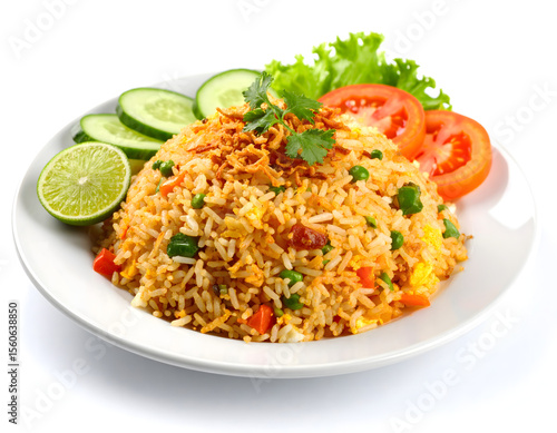 Indonesian Fried Rice (Nasi Goreng) with Egg and Vegetables on White Plate – Menu Presentation