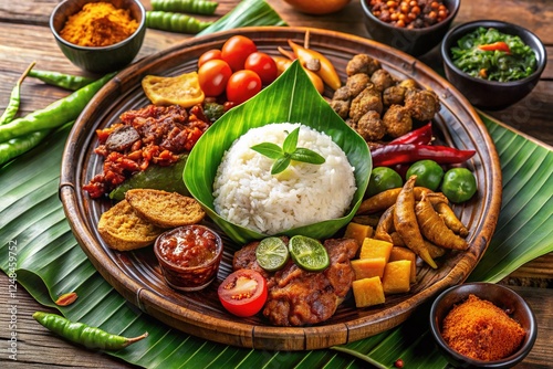 Indonesian Gudeg platter, vibrant colors, artful thirds.