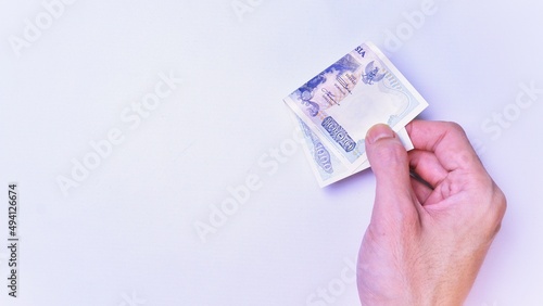Indonesian Rupiah the official currency of Indonesia. Man's hand is making a payment. Male hand showing Indonesian Rupiah Note. Business Investment Economy and Finance Concept Uang 1000 1.000 Rupiah