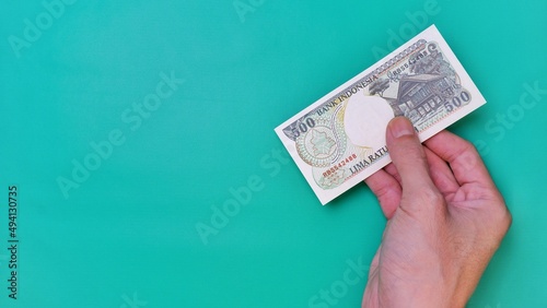 Indonesian Rupiah the official currency of Indonesia. Man's hand is making a payment. Male hand showing Indonesian Rupiah note. Business Investment Economy Loan and Finance concept. Uang 500 Rupiah