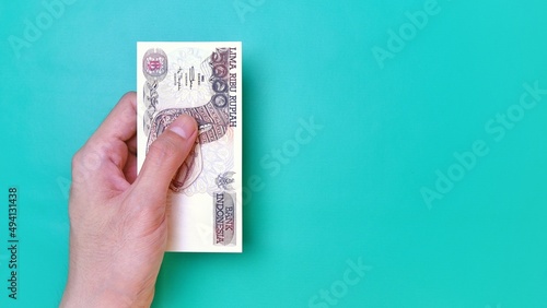 Indonesian Rupiah the official currency of Indonesia. Man's hand is making a payment. Male hand showing Indonesian Rupiah note. Business Investment Economy Loan and Finance concept. Uang 5000 Rupiah.