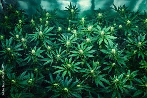 Indoor cannabis farm with rows of green plants under bright grow lights. Represents cultivation, agriculture, and the legal marijuana industry.