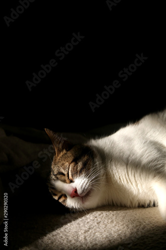 Indoor cat sleeping on a couch, illuminated by warm sunset light. Selective focus.