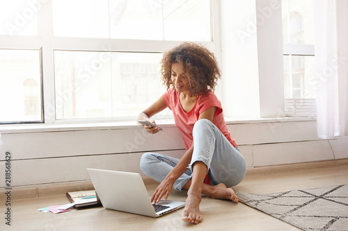 Indoor photo of charming dark skinned curly woman sitting near big window, holding smartphone in hand and checking mails on laptop, wearing casual clothes