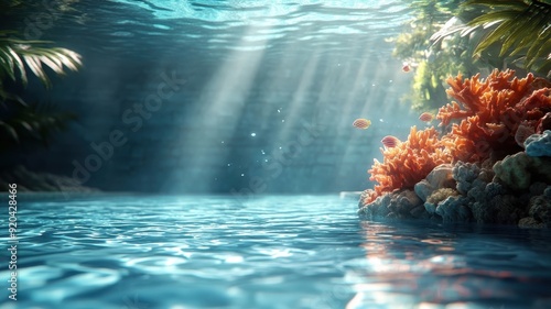 Indoor pool transformed into fantastical underwater world with coral reefs and fish.