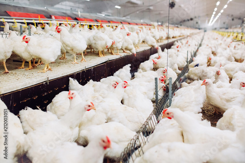 Indoors chicken farm, chicken feeding