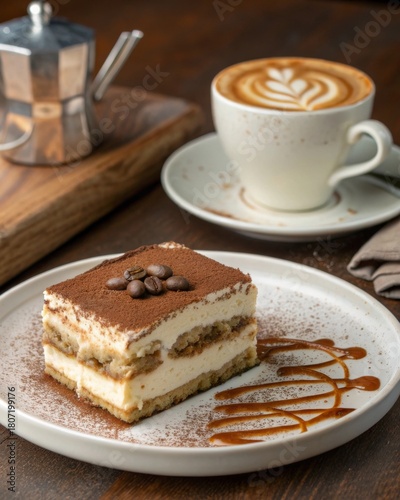 Indulge in a decadent tiramisu slice dusted with cocoa and cappuccino foam art authentic italian dessert experience in a charming setting for true dessert lovers