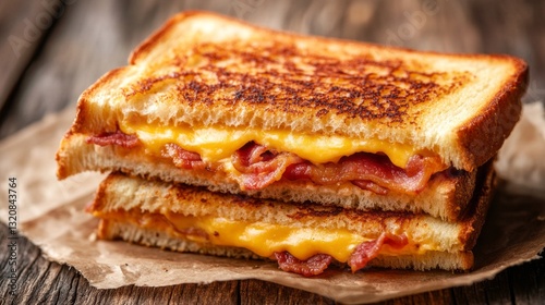 Indulge in a mouthwatering feast with layers of crunchy bacon and gooey melted cheese nestled between golden brown toasted bread, served on a rustic wooden table
