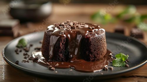 Indulge in a rich chocolate lava cake drizzled with smooth chocolate sauce, perfect for dessert lovers and special occasions.