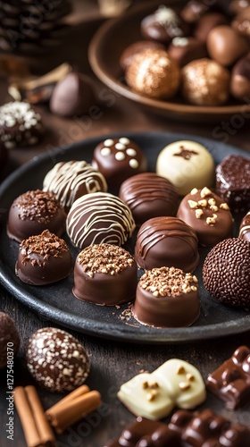 Indulgent assortment of gourmet chocolates on a black plate, inviting and rich in texture.