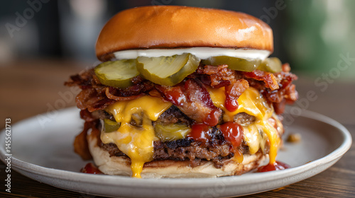 Indulgent Beef Burger Stacked with Cheese, Bacon, and Crispy Pickles on a Soft Bun