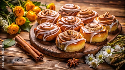 Indulgent Cinnamon Rolls in Vintage Style Photography with Warm Lighting and Rustic Background, Perfect for Cozy Bakery Atmosphere and Delicious Treats