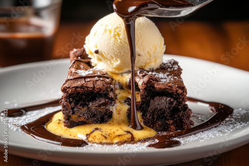 Indulgent dark chocolate brownie with molten center and ice cream dessert restaurant food styling elegant dining close-up sweet treats
