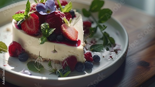Indulgent Heart-Shaped Raw Vegan Cheesecake With Fresh Berries and Edible Flowers Served on a Pristine Ceramic Plate