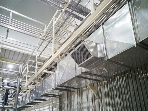Industrial air duct ventilation equipment and pipe systems installed on industrial building ceiling.