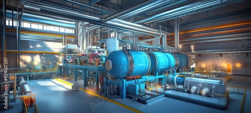Industrial boiler room, highlighting the process of heating, energy generation, and distribution within a large facility