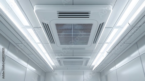 Industrial ceiling AC system, exposed metal ductwork, fluorescent lighting. Commercial building interior with white and silver color scheme, symmetrical composition, clean design.
