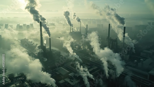 industrial city with large smokestacks, clouds of pollution on sunset