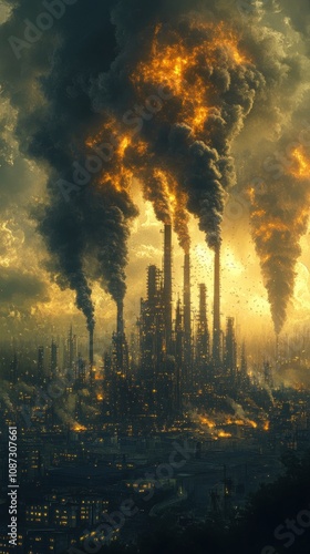 Industrial Cityscape with Smoke and Flames