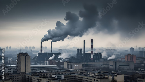 Industrial cityscape with smoke billowing from chimneys under a cloudy sky view