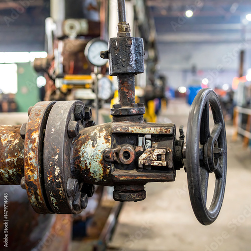 Industrial closeup of an aged, heavily corroded pipe valve in a factory setting. Symbolizes decay, neglect, or the passage of time. Perfect for backgrounds, textures, conceptual art.