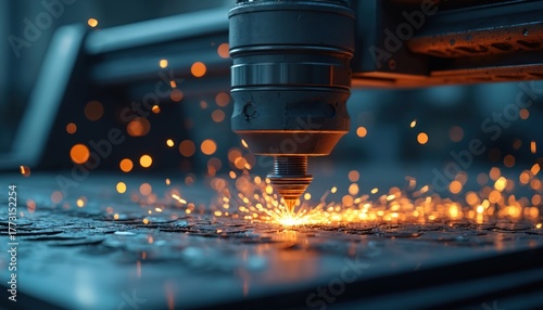 Industrial CNC laser machine head cuts metal sheet. Bright sparks fly from precision manufacturing process. Automated robot arm works in factory workshop, creating brilliant light effect. Modern tech