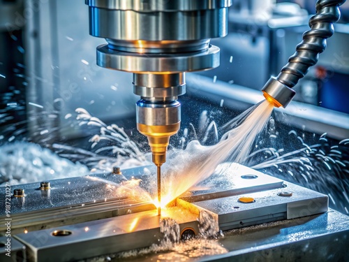 Industrial CNC machine precisely crafts a metal part as coolant liquid sprays, ensuring temperature control and accuracy in a modern manufacturing process.