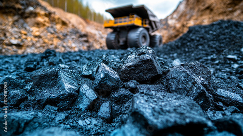 industrial coal pile with blurred heavy machinery in the background symbolizing energy production industrial strength and the environmental impact of fossil fuels in modern society