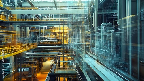Industrial Complex Interior Showing Extensive Piping and Catwalks