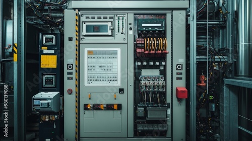 Industrial control panel in a power plant. Wiring and electrical components are neatly organized in a grey metal enclosure.